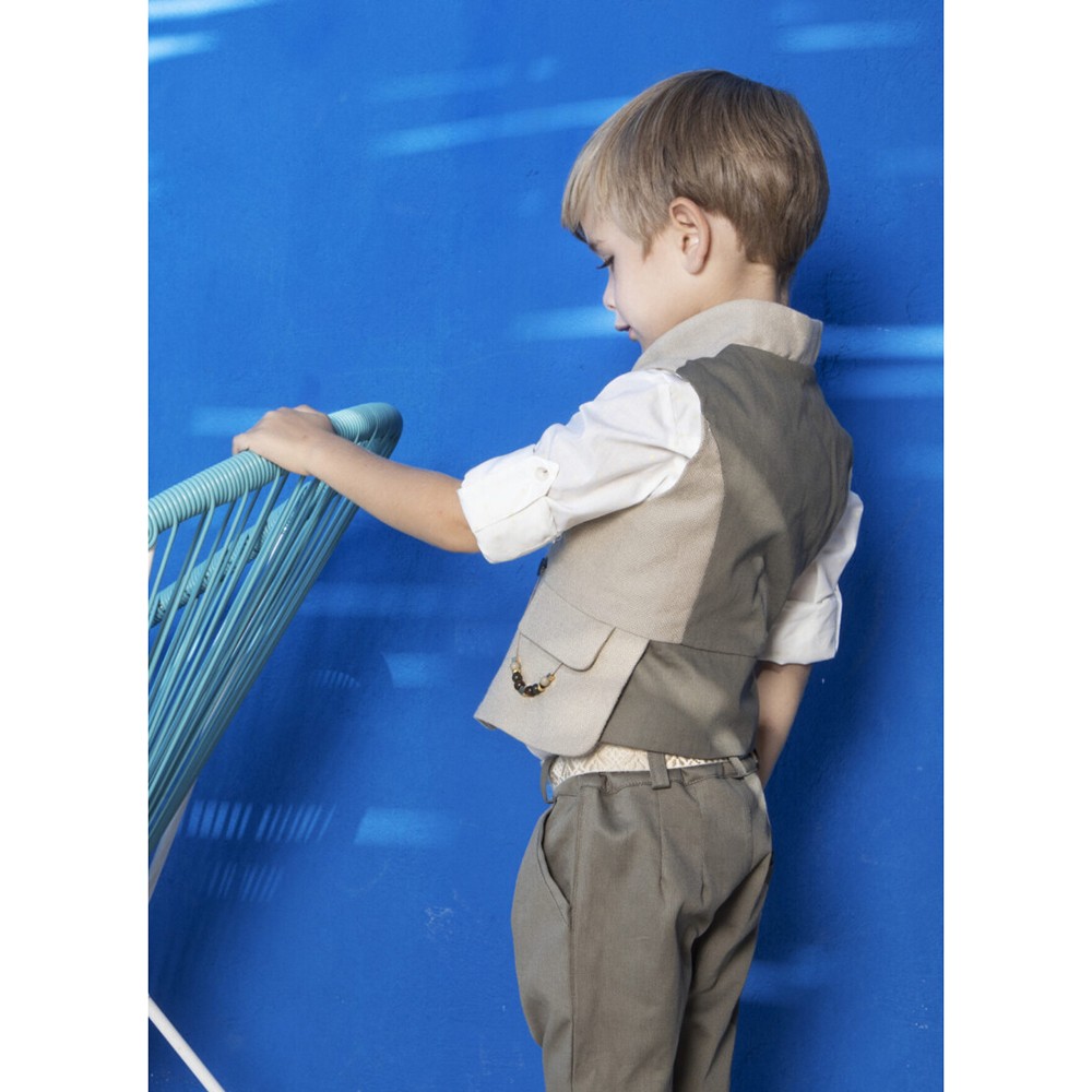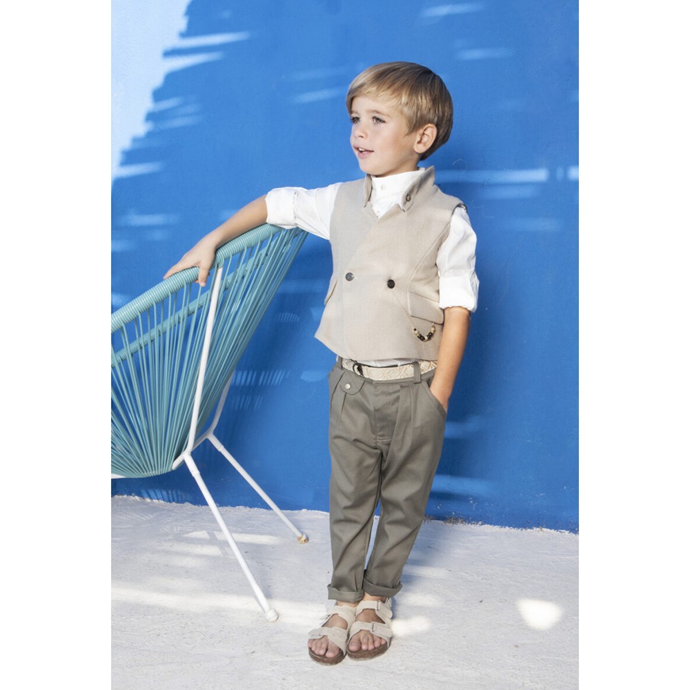 Σετ βάπτισης Baby Bloom της συλλογής stile di vita mediterraneo 2024, ένα κομψό μοντέρνο σετ που αποτελείται από παντελόνι χακί βαμβακερή καπαρντίνα, πουκάμισο λευκό βαμβακερό και γιλέκο λινό σε απόχρωση μπεζ με διχρωμία στην πλάτη χακί και ιδιαίτερο στολισμό και κούμπωμα. Στο σετ περιλαμβάνονται επίσης τιράντες και ψάθινο καπέλο.