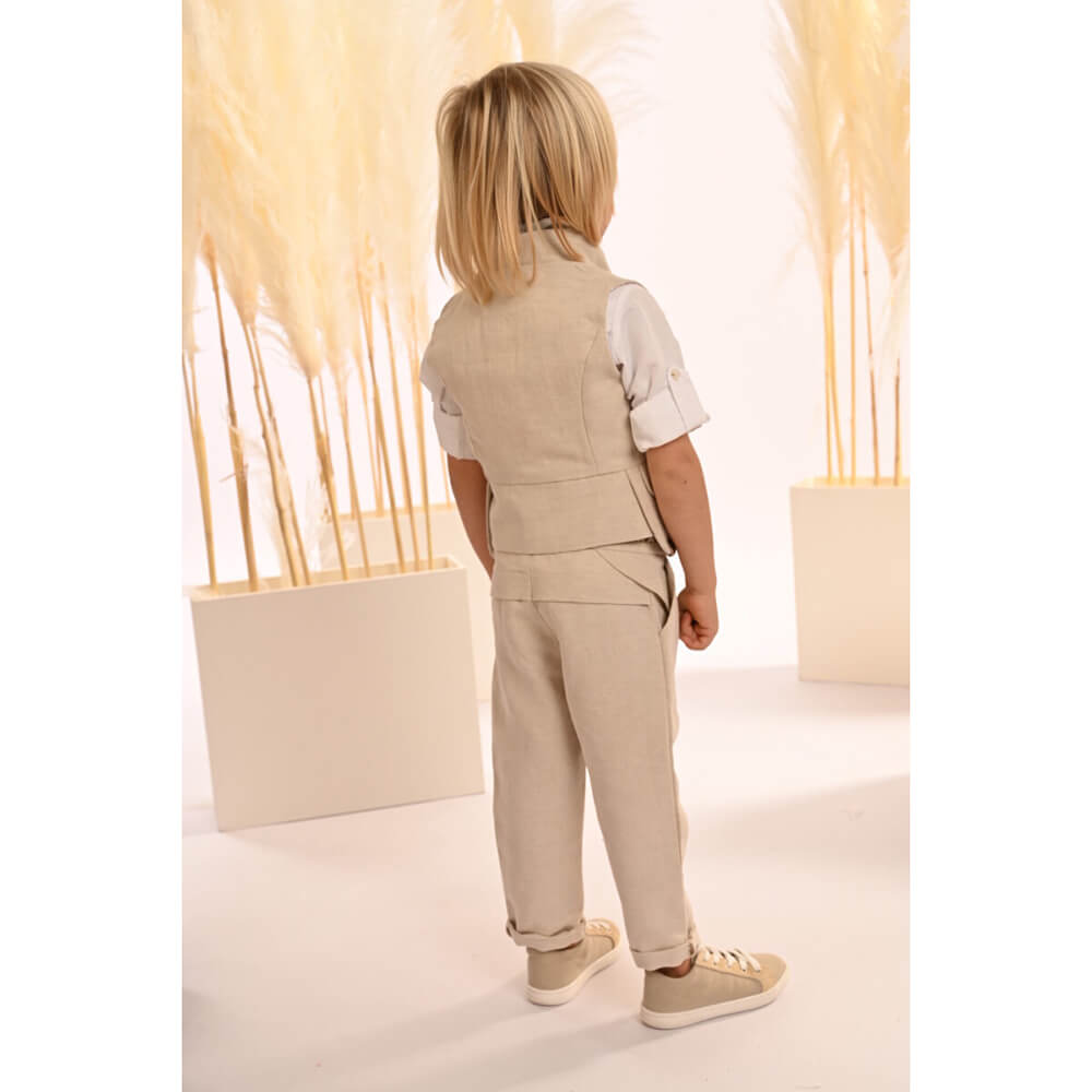 Σετ βάπτισης Baby Bloom της συλλογής Glow Delight 2025.Το παντελόνι από μελανζέ cotton-lino ύφασμα σε μπεζ αποχρώσεις ξεχωρίζει για το μοναδικό του σχέδιο στο πίσω μέρος, προσθέτοντας μια διακριτική αλλά εντυπωσιακή λεπτομέρεια. Το σταυρωτό γιλέκο με reverse πέτο και τσέπες με πατάκια προσδίδει επιπλέον κομψότητα και κλασική γραμμή στο look. Το βαμβακερό πουκάμισο σε off white απόχρωση, με τον πολύ ιδιαίτερο mao γιακά, ολοκληρώνει το σύνολο με μία διαχρονική πινελιά, ενώ το personalized βουάλ φουλάρι με γεωμετρικά σχέδια σε μπεζ-λαδί αποχρώσεις προσθέτει χαρακτήρα και μοναδικότητα. Η ζώνη από υφαντό ιμάντα και το ψάθινο καπέλο ή η τραγιάσκα (ανάλογα με την προτίμηση) συμπληρώνουν το outfit, δημιουργώντας μια ισορροπημένη εμφάνιση γεμάτη στυλ και αρμονία.